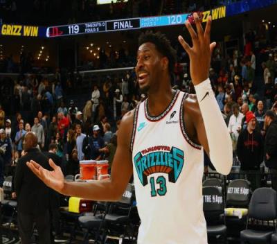 本场比赛,灰熊内线小贾伦表现出色,进攻端十分高效,拿下全场最高分,仅打28分钟,投篮16中10,三分球5中4,罚球9中8,砍下32分5篮板4助攻1盖帽的数据,正负值+29。