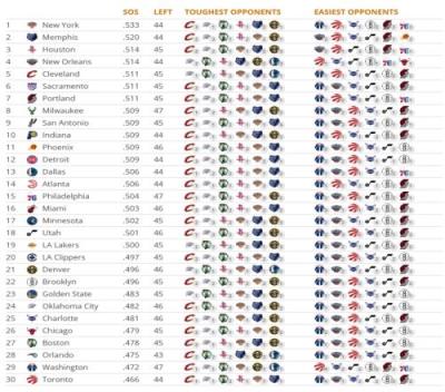 排名越高剩余赛程难度越高,排名越低剩余赛程难度越低