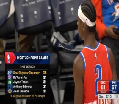 比赛进行到第三节,雷霆球星亚历山大已经砍下28分。