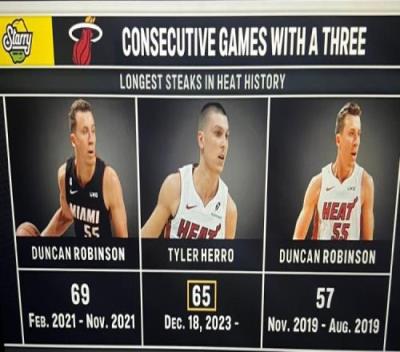 这样一来,希罗已经连续65场比赛命中三分,目前排名队史第二位,队史纪录为邓肯-罗宾逊的69场。