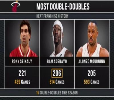 阿德巴约取得生涯第206次两双超越莫宁&上升至热火队史第二位
