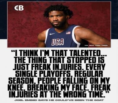 恩比德表示,如果不是经常遭遇伤病,他本有可能成为GOAT,他说道:“我觉得我非常有天赋。如果你仔细想想,这些年来阻碍我的就是严重的伤病。每一个系列赛,常规赛,都有人撞到我的膝盖,或者撞到我的脸——两次。这些奇怪的伤病总是在错误的时间发生的。”