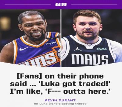 今天,杜兰特在接受采访时表示:“球迷们当时在电话上说,‘卢卡被交易了。’我的反应是,‘滚吧。’”