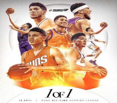 布克第三节底角接球三分打进,得到本场第24分,太阳生涯得到15668分,超越沃尔特-戴维斯(15666分)加冕太阳队史得分王。