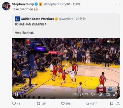 赛后本场缺阵的库里转发了该回合,写道:“接管比赛吧。”