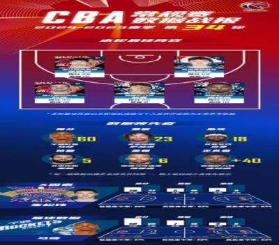 体育资讯1月24日报道宣称 今日,CBA官方公布了第三十四轮最佳阵容,余嘉豪、杨瀚森、约克、赵睿、皮特森入选。原文如下: