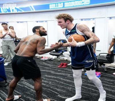 本场比赛结束后,独行侠将比赛用球送给了凯利,欧文在更衣室与其拥抱致意!