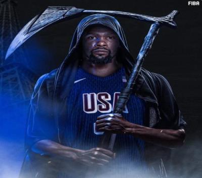 赛后,国际篮联发布了一张杜兰特的死神镰刀P图,并写道:“骷髅死神杀手!就是他!”