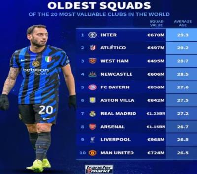 体育资讯2月8日报道宣称 《转会市场》统计了德转身价排名前20俱乐部的平均年龄,并列出前十榜单。