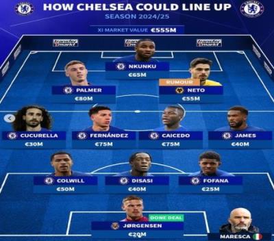 体育资讯8月10日报道宣 多方消息确认,切尔西将签下狼队边锋内托,《转会市场》也据此预测了蓝军新赛季主力阵容。