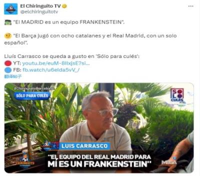 路易斯-卡拉斯科是巴塞罗那营销公司的副总裁,也是一名巴萨球迷。他在节目中表示:“皇马是一支弗兰肯斯坦队......巴萨有八名加泰罗尼亚人参加比赛,而皇家马德里则只有一名西班牙人。”