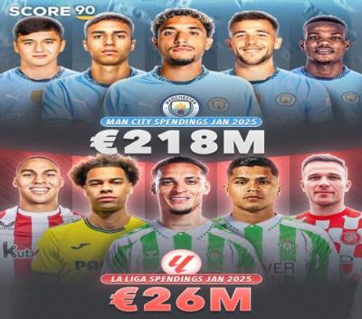 体育资讯02月05日报道宣称 2025年冬季转会窗关闭,西甲成为欧洲五大联赛里支出数字最低的联赛,他们支出的转会费甚至不及英超的零头。