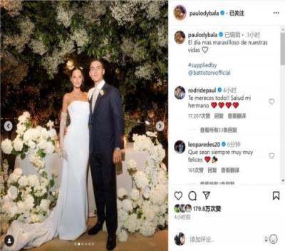 迪巴拉与相恋六年的女友奥莉安娜近日举办婚礼,这位阿根廷前锋在社交媒体上晒出婚礼照片,并配文:“我们生命中最美好的一天。”德保罗、帕雷德斯等国家队队友留言祝贺。