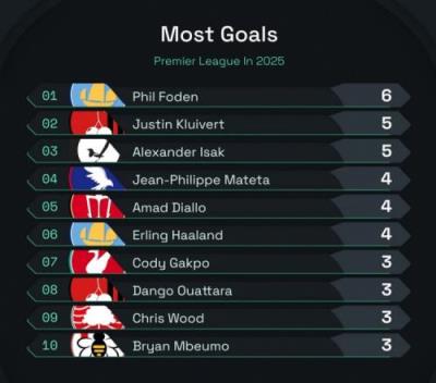今年英超进球榜:福登6球居首,伊萨克5球第2,阿玛德、魔人等第4