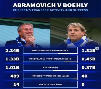 阿布时代(19年):引援耗资23.4亿,出售获得13.3亿,净支出10.1亿,共计489笔转会,14冠