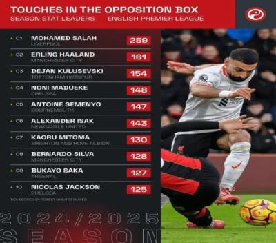 体育资讯2月5日报道宣称 Squawka统计了本赛季英超球员在对方禁区内触球情况,萨拉赫断崖领跑。