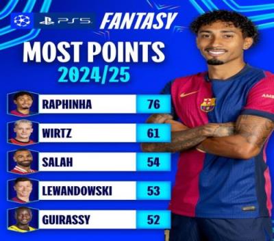 体育资讯1月24日报道宣称 欧冠小组赛阶段第7轮比赛已经完赛,欧冠官方也统计了本赛季球员表现积分情况,拉菲尼亚领跑。