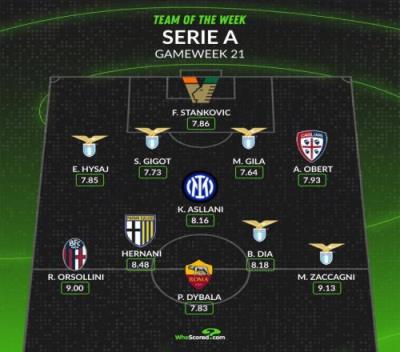 WhoScored意甲第21轮最佳阵:迪巴拉、阿斯拉尼在列,拉齐奥5人