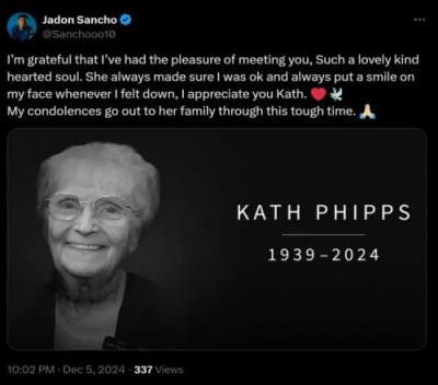 体育资讯12月5日报道宣称 在曼联工作了55年的资深员工卡斯-菲普斯离世,享年85岁。桑乔发文悼念了这位深受球员和球迷们喜爱的接待员。