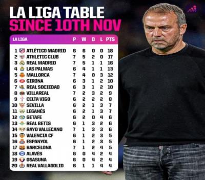 体育资讯12月24日报道宣称 Opta统计了西甲球队11月10日以来拿到的积分,并列出榜单,马竞6战全胜18分居首,毕尔巴鄂17分次席,皇马16分第三,巴萨5分倒数第四。
