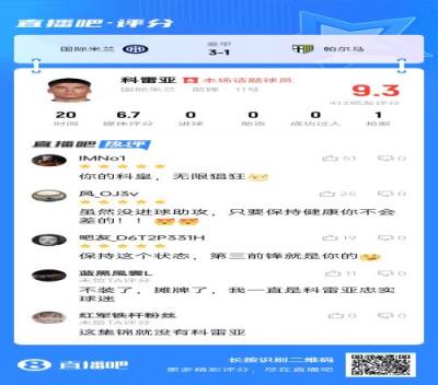 真救回来了!科雷亚获吧友评9.3分上季19场0球0助+留队当第5前锋