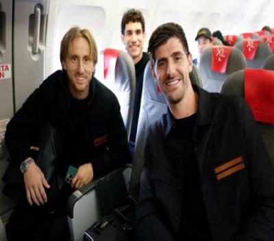 皇马官方晒出球员照片,球队从马德里巴拉哈斯机场出发,正在前往贝加莫途中。