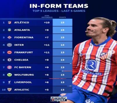体育资讯12月13日报道宣称 德转盘点了五大联赛球队近5场比赛战绩榜,其中马竞、亚特兰大、佛罗伦萨均是五连胜,以下为具体榜单(积分,净胜球):