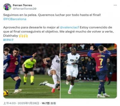 体育资讯1月28日报道宣称 西甲第21轮比赛,费兰-托雷斯破门,帮助巴萨7-1击败瓦伦西亚,赛后他在社交媒体上庆祝胜利,并为老东家瓦伦西亚送上祝福。