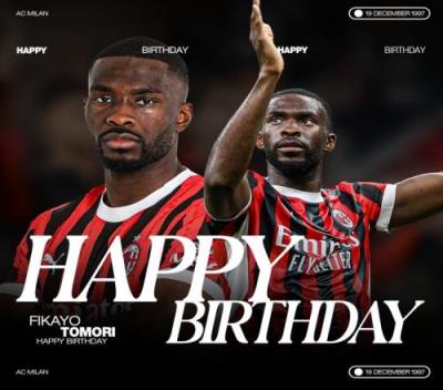 体育资讯12月19日报道宣称 今天是米兰后卫托莫里的27岁生日,米兰官方为他送上祝福。