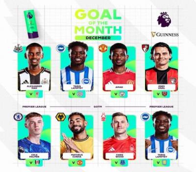 体育资讯1月2日报道宣称 英超官方公布了12月最佳进球的候选名单,伊萨克、阿玛德、帕尔默的进球在列。