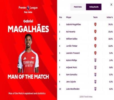 体育资讯12月28日报道宣称 本轮英超,阿森纳主场1-0伊普斯维奇。赛后,加布里埃尔当选英超官方发起的票选全场最佳球员。