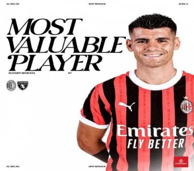 米兰官方账号在社交媒体上晒出为莫拉塔制作的海报,宣布这位31岁的西班牙前锋在加盟后的首场正式比赛中当选米兰队内最佳球员。