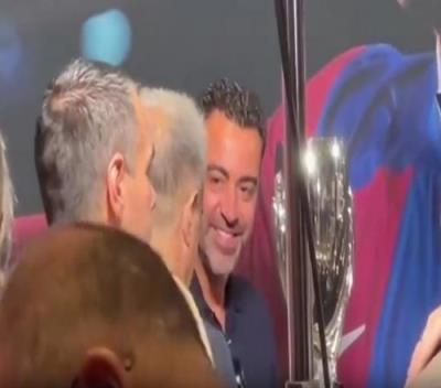 每体:拉波尔塔主动与哈维打招呼,双方互相拥抱&哈维保持微笑
