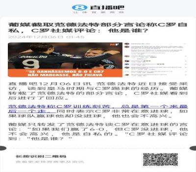 葡媒报道范德法特对C罗的评价,单独拎出一句“如果我们6-0赢球但C罗没进球,他不会高兴,他是自私的”,C罗下场留言回怼:“这人是谁啊?”