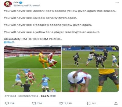赛后有枪迷在社媒晒出阿森纳本赛季在英超遭遇的多次争议判罚,写道: