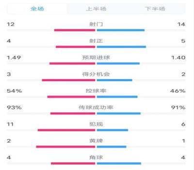 莱斯特城02曼城数据:射门1214,射正45,控球率54%46%