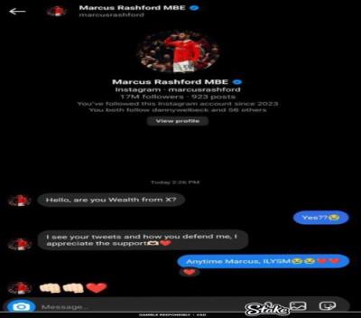 昨天,Wealth晒出了一张Instagram的私聊截图,称拉什福德给他发了私信。截图中,拉什福德主动找上Wealth并问:“你是推特的Wealth吗?”