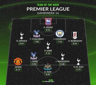 WhoScored英超本周最佳阵:阿玛德、伊萨克入选,热刺4将领衔