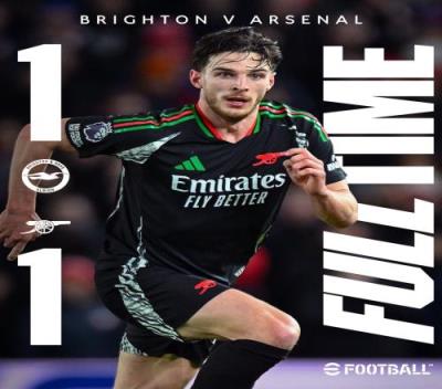 体育资讯01月05日报道宣称 英超第20轮阿森纳1-1战平布莱顿,仍居积分榜第2位。