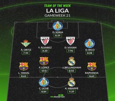 体育资讯1月28日报道宣称 西甲第21轮比赛战罢,WhoScored列出了本轮最佳阵容,姆巴佩、贝林厄姆、亚马尔、拉菲尼亚、费尔明在列。