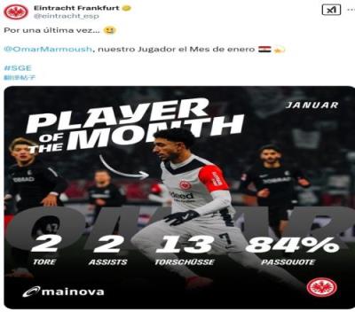 体育资讯2月5日报道宣称 北京时间周三晚,法兰克福官方宣布马尔穆什当选球队1月最佳球员。