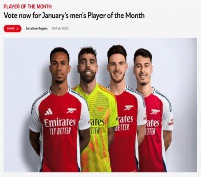 体育资讯2月4日报道宣称 阿森纳官方公布1月队内最佳候选,加布里埃尔、拉亚、赖斯、马丁内利获提名。