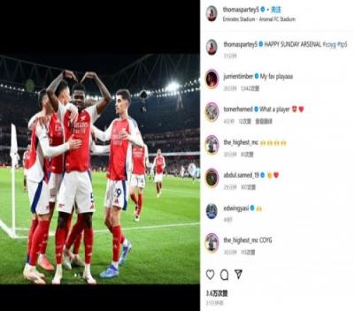 托马斯也晒出自己进球后双手比心的庆祝照,并配文:“枪手们周日快乐!”