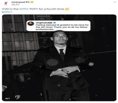 范迪克入选PFA年度最佳阵容,他在社交媒体上发文致谢,利物浦官方账号晒出范迪克的社媒截图,写道:“范迪克第四次入选PFA年度最佳阵容。”并配上了鼓掌的表情符号。