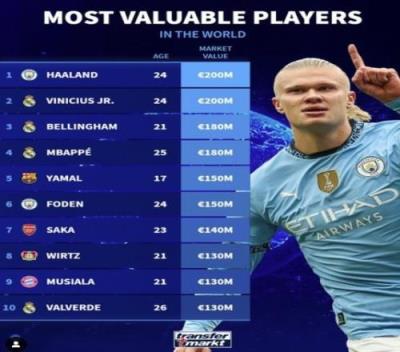 1. 哈兰德(曼城) 24岁 身价2亿欧元