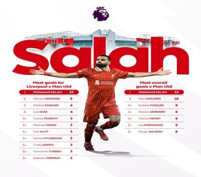 红魔杀手!萨拉赫对曼联打入13球,队史第一+英超历史第一