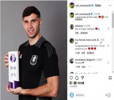 马丁内斯凭借对阵诺丁汉森林的神扑,获得英超12月最佳扑救奖,他在社交媒体上晒出自己手拿奖杯的照片,配文:“感谢大家的投票。”