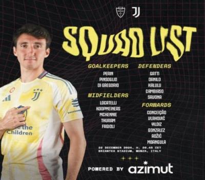 体育资讯12月22日报道宣称 北京时间明天凌晨3:45意甲第17轮,尤文将在客场对阵蒙扎。赛前,尤文公布了将出战本场比赛的大名单。