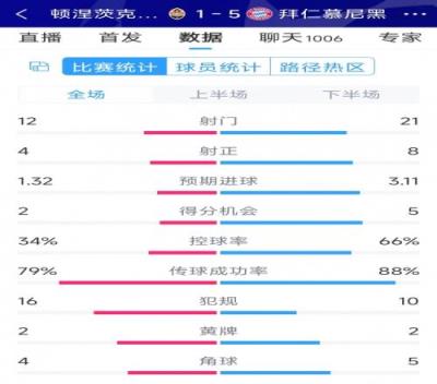拜仁51顿涅茨克矿工全场数据:射门2112,射正84