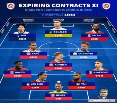 德转今年合同到期阵容:C罗领衔,萨拉赫、孙兴慜、德布劳内在列